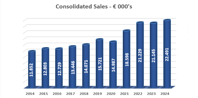 Consolidated sales for the fiscal year ended December 31, 2024, amounted to €22,432,985, representing a 6.5% increase compared to €21,064,598 in 2023. While sales growth was solid, a slight contraction in the gross profit margin, together with higher operating expenses and increased financing costs, weighed on bottom-line performance. Consolidated net income for 2024 totaled €1,058,951, or 4.7% of sales, reflecting a 15.2% decrease from €1,248,826, or 5.9% of sales, recorded in the prior year.